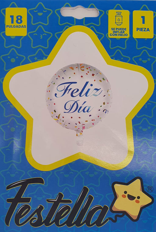 Precio original $4.200,00Precio actual $2.500,00| /Globo Metalizado Feliz Dia Azul Blanco Confetti y Serpentinas 18" Festella