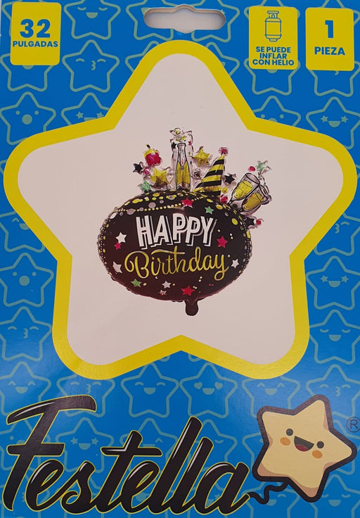 FestellaGlobo Metalizado Feliz Cumpleaños Estrellas y Copas Negro 18" Festella