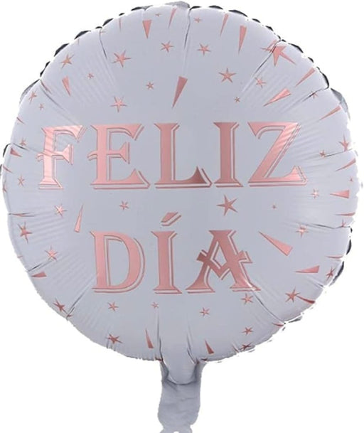 Precio original $2.800,00Precio actual $1.800,00| /Globo Metalizado Redondo Feliz Dia Blanco Dorado Rosa 18"
