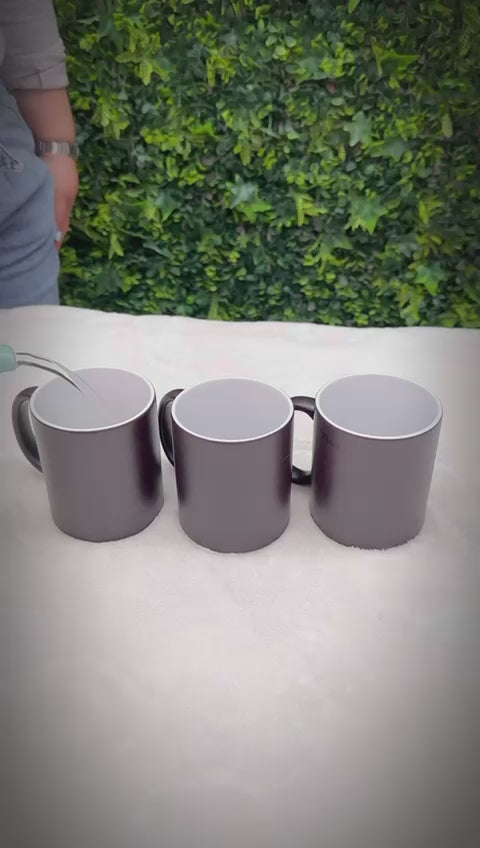 Este Mug Cambia de color al entrar en contacto con bebidas calientes. El color externo es negro, pero una vez cambie la temperatura interna podras observar el diseño Sublimado en el Mug.
